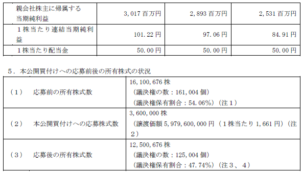 (注2) 「 本公開買付けへの応募株式数」欄の譲渡価額は、当社が本公開買付けに応募する株式数(応募株式数)に本公開買付けの買付価格を乗じた額を記載しております。